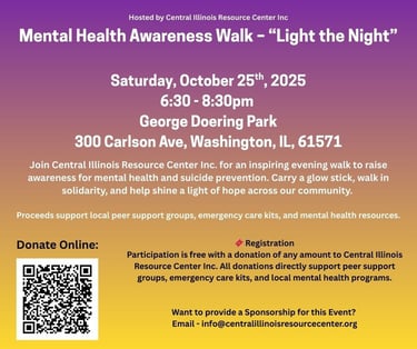 Join Central Illinois Resource Center Inc. on Saturday, October 25th, 2025 at George Doering Park in Washington, IL for our first-ever “Light the Night” Mental Health Awareness Walk. This evening walk is a community-wide event dedicated to raising awareness for mental health, suicide prevention, and showing support for individuals and families affected by mental illness.