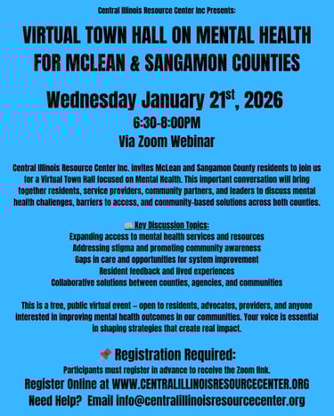Central Illinois Resource Center Inc. is hosting a Virtual Town Hall focused on mental health to bring together residents, service providers, community leaders, and advocates from McLean and Sangamon Counties. This event provides an open forum to discuss current challenges, share lived experiences, and explore collaborative solutions that strengthen mental health support in our communities.